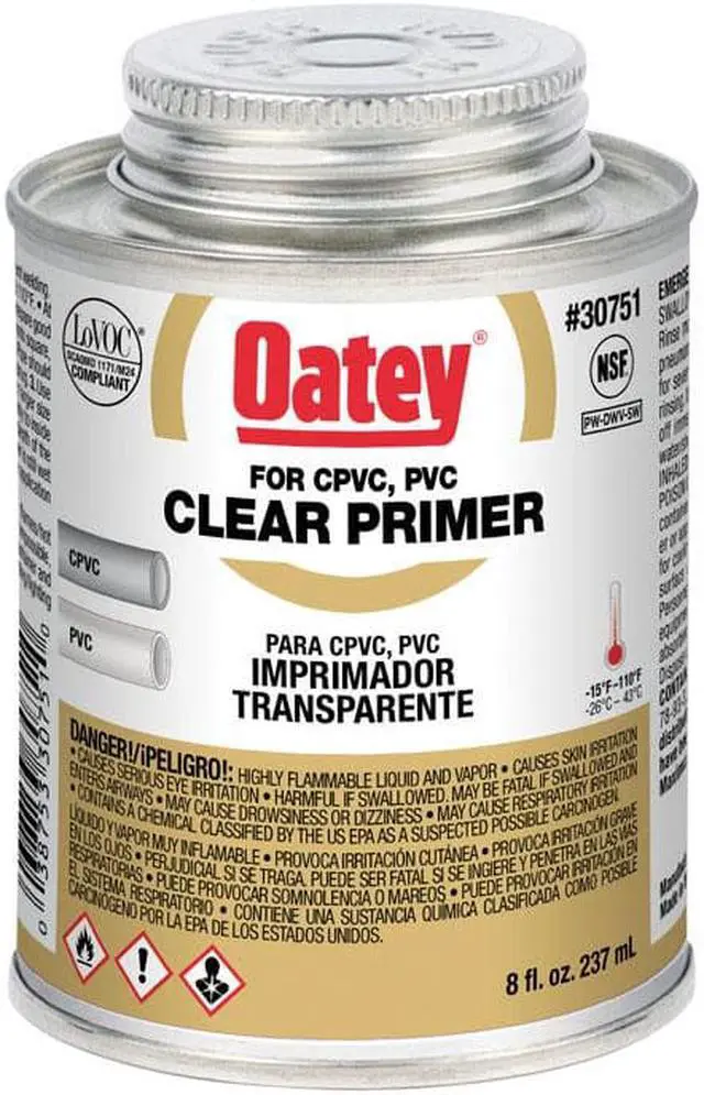 Clear aggressive primer for use on PVC and CPVC pipe and fittings. Low VOC Solvent Cement meets SCAQMD California (South Coast Air Quality Management District) 1168/316A or BAAQMD (Bay Area Air Quality Management District) method 40 and various environmental requirements. Removes surface dirt, grease and grime as well a softens the pipe surface to allow a fast, secure solvent weld. NSF (National Sanitation Foundation) Listed. Meets ASTM (American Society for Testing and Materials) F656.