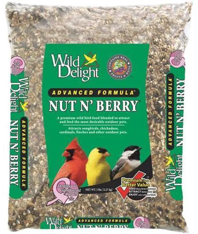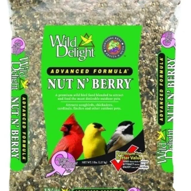 A premium wild bird food blended to attract: Songbirds, woodpeckers, cardinals, finches, titmice, jays, grosbeaks, buntings, nuthatches, and chickadees. Feed features: Real fruit, real nuts, hulled seeds, added vitamins, added minerals, electrolytes, and amino acids. No. 366050: Type: Nuts & Berries, Weight: 5 lb, Ingredients: Sunflower Kernels, Peanuts, Safflower, Pkg Qty: 1, Package Type: Bag No. 366200: Type: Nuts & Berries, Weight: 20 lb, Ingredients: Sunflower Kernels, Peanuts, Safflower, Pkg Qty: 1, Package Type: Bag