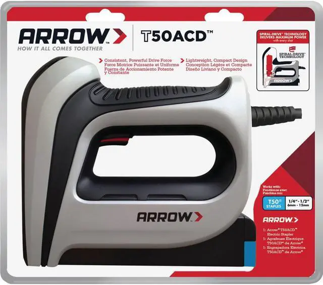 Arrow\\'s T50ACD Compact Electric Staple Gun features an innovative motor-driven mechanism for consistent powerful performance. Its compact, lightweight design makes it ideal for job sites or work at home. It\\'s ideal for applications like upholstery, general repairs and insulation, as well as projects like screening, house wrap, and picture framing.. Uses up to 1/2" T50 staples. Spiral Drive Technology for consistent & powerful performance. Easy-access magazine release for quick reloading