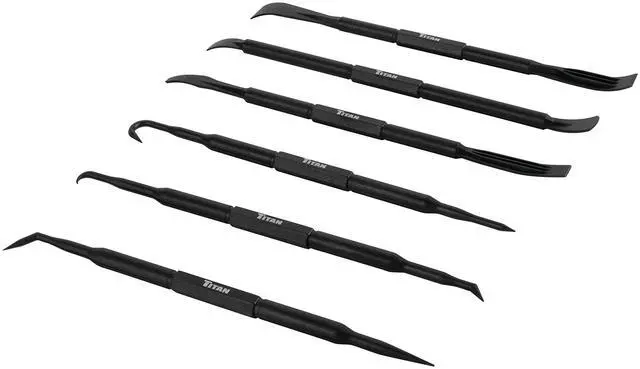 Titan 17716 6-Piece Non-Marring Pick, Hook, and Pry Set featires glass-reinforced nylon composite material that is flexible, strong, lightweight, non-conductive, non-corroding, and solvent resistant. Double-ended design provides multiple tip options, ensuring the right tool for the job. Access battery compartments, open small body panel fastener covers, separate electronic assemblies, o-rings, seals, gaskets, clips, and cleaning tight gaps in interior components, handling delicate wiring and connectors, etc. Made in Taiwan.