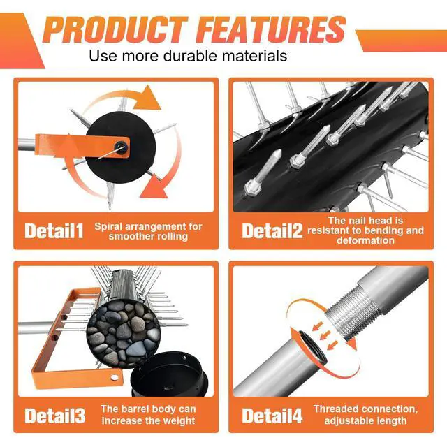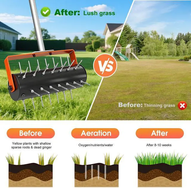 Suitable for Any Soil Type: The 2-inch high-strength steel spikes are unbreakable, and the sharp rolling spikes can easily penetrate any dense soil. Suitable for any soil type. No matter how hard the ground is, you can experience easy and efficient aeration