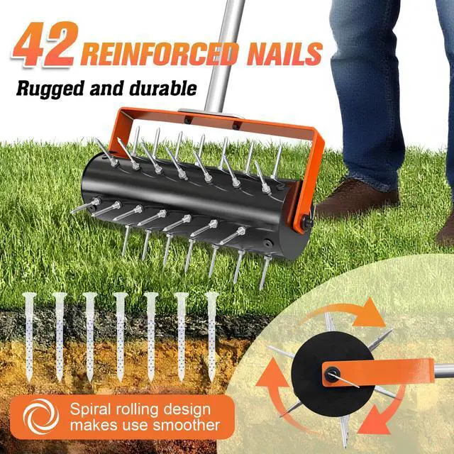 Stable&Durable&Efficient: The tines of this grass aerator feature a unique spiral pattern that forms a perfect circle when viewed from the side when in use. This design ensures a smooth, continuous roll and minimises vertical runout, providing superb stability.This yard aerator has 42 reinforced 2-inch toothed pegs, and they are all heat-treated to greatly increase hardness and strength, making them less prone to warping. It also improves performance, extends durability and increases efficiency