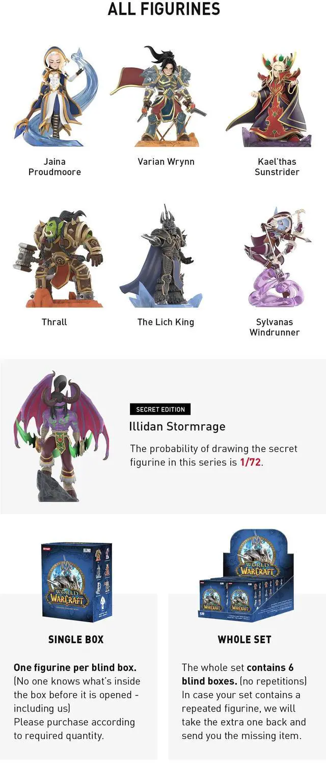 Step into Azeroth with this epic blind box series from POP MART World of Warcraft. Featuring iconic heroes and villains reimagined in collectible mini form, this series is a must-have for longtime fans and new adventurers alike. From Sylvanas to the Lich King, each figure brings legendary presence with bold colors and chibi-style charm.