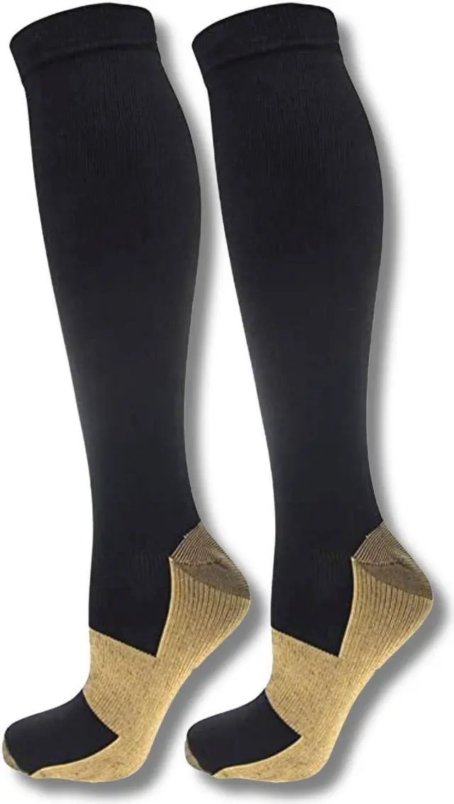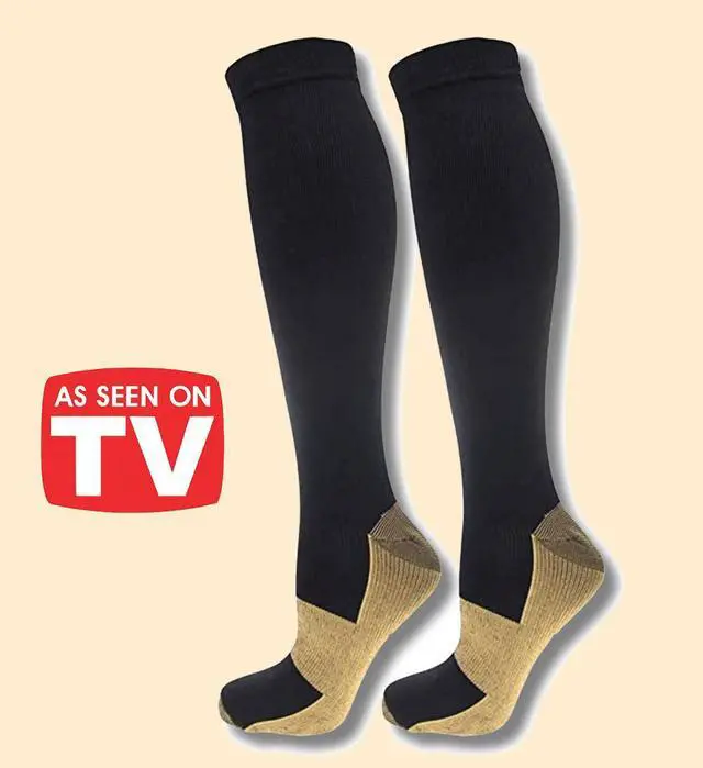 As Seen on TV Experience the benefits of our copper-infused compression socks, featuring graduated mild compression to soothe swollen feet and legs, boost circulation, reduce swelling, and relieve aches and soreness. Made from breathable fabric, these socks effectively control odor and keep your feet dry. They come in non-retail packaging for your convenience. Available in black, the Small/Medium size fits women's shoe sizes 6- 9.5 and men's shoe sizes 5- 9.5.