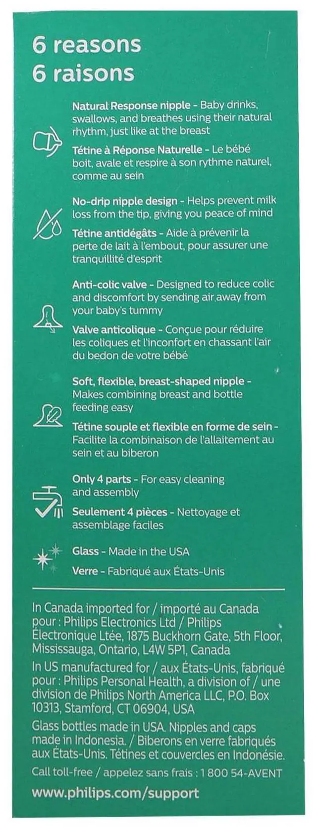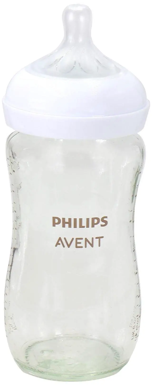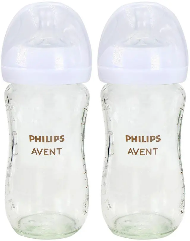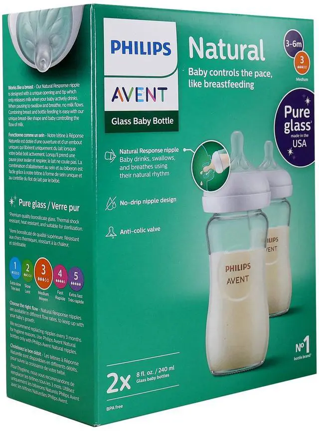 Philips Avent Natural Glass Baby Bottles with Natural Response Nipples (Medium Flow, Flow 3), 8oz, 2-Pack, SCY913/02 Philips Avent Natural glass bottles for babies support the well-being of your baby so you can take the best care of yourself. The Natural Response nipple with the unique opening and tip lets your baby control the pace of the milk flow, releasing milk only when actively drinking - just like babies do during breastfeeding. When pausing to swallow and breathe, no milk flows. Feeding feels as natural as from the breast!Easily combine breast and bottle feeding with a wide, soft and flexible nipple that mimics the shape and feel of a breast. It helps the baby to latch on and feed comfortably, using its natural rhythm. With the no-drip design, the nipple helps prevent spills and lost milk. An anti-colic valve integrated into the nipple is designed to reduce colic and discomfort by sending air away from your baby's tummy.The ergonomic shape makes it comfortable for parents to hold and easy for small fingers to grasp. Assembly is simple, with only a few parts, while the wide bottleneck makes filling and cleaning easy. Philips Avent Natural glass baby bottles are made of premium quality borosilicate glass, a BPA-free material. They're heat and thermal shock resistant, so they can be safely stored in the fridge, warmed and are easy to wash and sterilize. Use the Philips Avent Natural glass baby bottles with Philips Avent Natural Response bottle nipples. It is totally natural for your baby to take 2-3 tries to get milk flowing from a new bottle. We have 5 different nipple flow rates for the Natural bottle. When looking for the right one, age is a guide, but your baby's approach to drinking and the feeding cues will help determine when to move to a higher or lower nipple flow rate. IQVIA Health ProVoice Survey 2025, USA