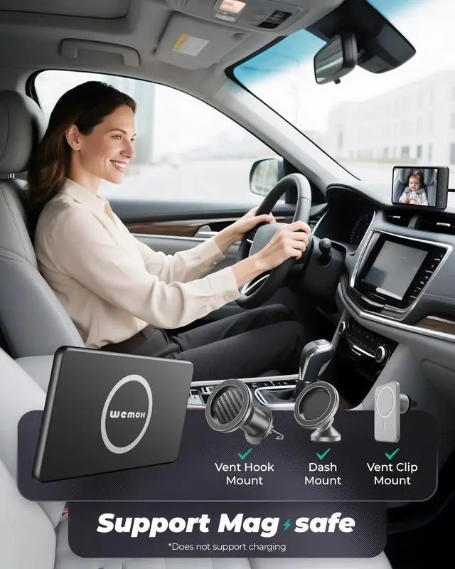 Born from 100s of parent gripes: Frustrating clips, fixed position & bulky gear. Our patent-pending magnetic design solves it! Snap our baby car monitor securely onto ANY magnetic car phone mount. Pull off & stash in 1 sec. Real parent pain. Real simple fix