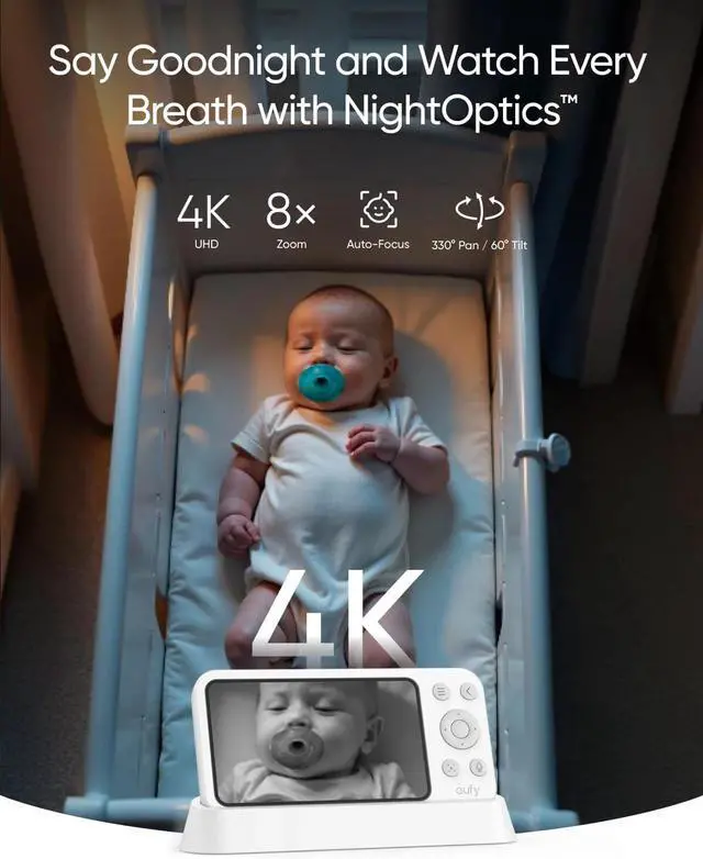 4K UHD Resolution to See Every Detail, Day and Night: With a 330° pan, 60° tilt, and 8× zoom, you'll catch every corner and facial detail, even seeing their chest rise and fall in the dark thanks to crystal-clear night vision. If you have twins, monitor both with two feeds on one split screen.