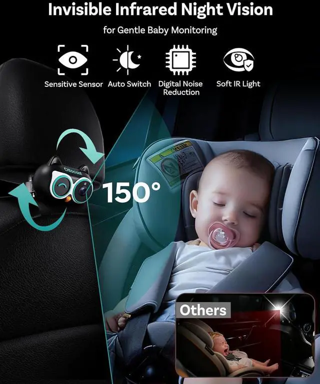 Infrared Night Vision Clear, No Glare, No Disturbance:Next-gen IR night vision with 940nm invisible light keeps your baby visible even in complete darknesswithout harsh glare or waking them. The built-in light sensor auto-switches between day and night modes for seamless 24/7 monitoring, whether you're on a nighttime drive or stuck in traffic after sunset.