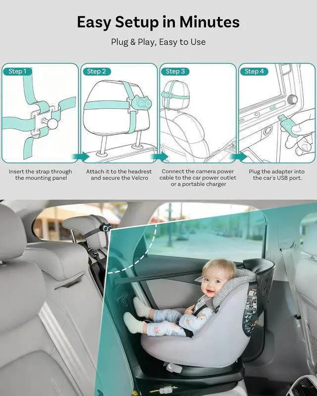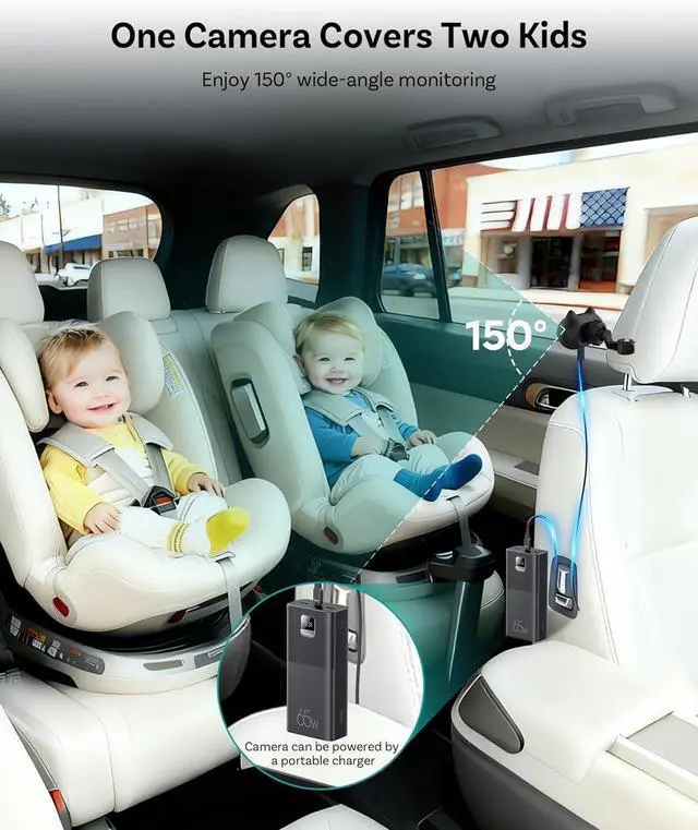 150° Wide Angle And Fully Adjustable View:With a 150° horizontal view and 360° swivel mount, one camera easily covers the entire back seatideal for families with multiple kids or pets. Quickly adjust the angle to check on rear-facing car seats or catch a better view during long road trips or school drop-offs.