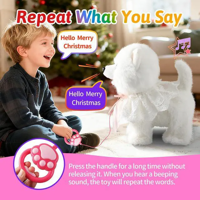This toy dog ??has multiple functions; it can walk and sing, wag its tail, lick its tongue, and even repeat what you say. It can walk around at home and outdoors, satisfying play needs in different places.