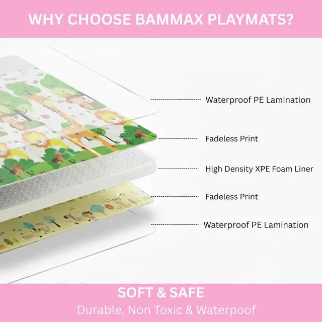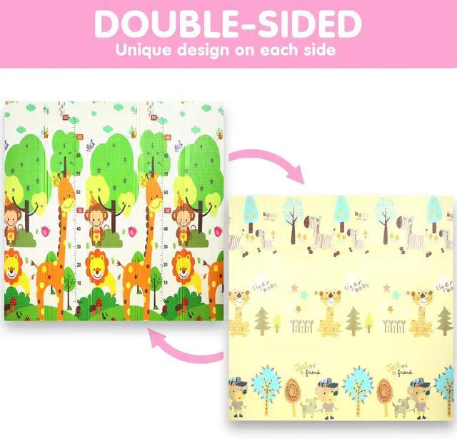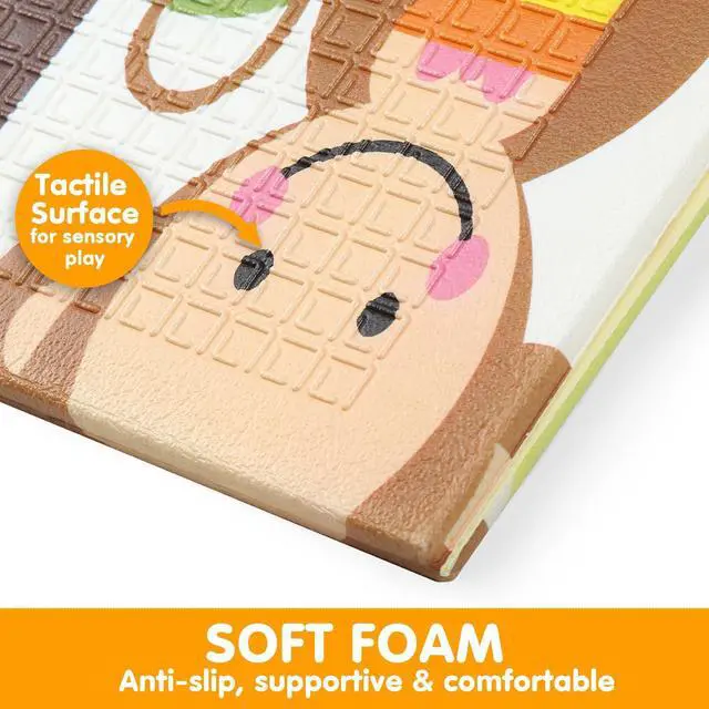 extra large play mats for babies and toddlers are perfect for crawling, tummy time and more. These foam floor mats are constructed with soft, yet durable and thick XPE foam for superior cushioning, safety and comfort. Our play mat for toddlers and baby are available in an extra large size measuring 70" x 78" to ensure greater coverage and give baby all the room they need to crawl and play and feature a fun, double-sided design with a unique experience on each side. In addition, these baby play mats feature a unique tactile surface, including raised numbers and letters, to enhance sensory exploration. The tactile surface also acts as an anti-slip grip, making this a safer surface for play. These floor mats are waterproof for quick and easy cleaning. The waterproof design and layered foam prevents absorption, blocks stains and prevents odors. To clean, simply wipe with a damp cloth or sponge. The large size mat is also perfect for use underneath a play pen, playard or play gate for added cushioning. Perfect for travel, this floor mat for baby is lightweight & foldable for easy portability. The mats fold down compactly so they easily fit in cars or for storage. These foldable baby play mat also includes a storage bag with carry handles for added convenience and flexibility when traveling or storing.