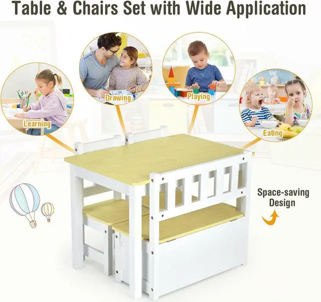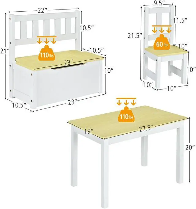 -The set includes a table, 2 chairs, and a storage bench, and can accommodate 3-4 children at the same time