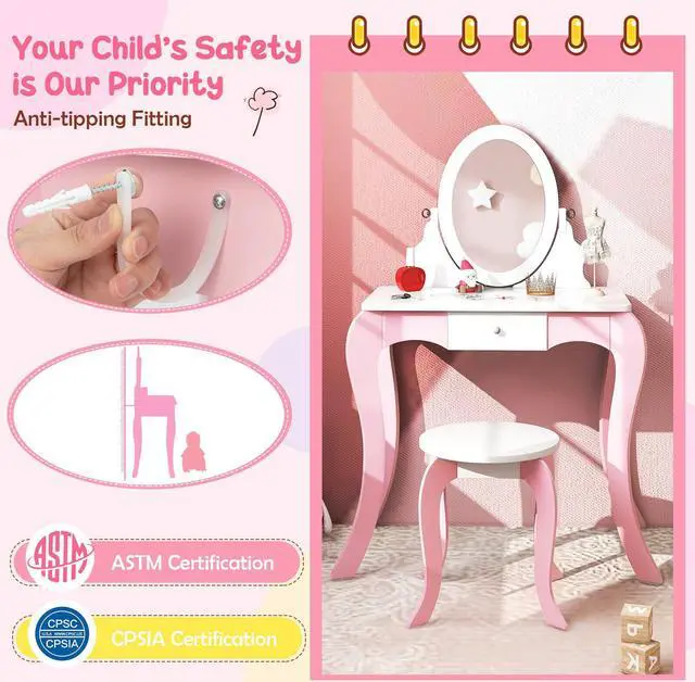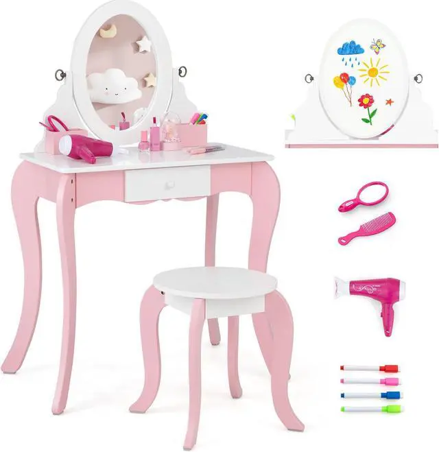 Rotatable and Versatile Mirror:This 2-in-1 kids vanity set features a convertible mirror that can be rotated 360°. Hence, the mirror can also serve as a whiteboard as you need. And there are 4 markers in different colors included, with which children are able to write on the whiteboard side and erase it with the other end.