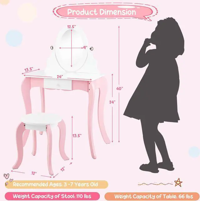 Sweet Accessories:The kids vanity table and chair will come with sweet accessories to add fun. The hair dryer works with a 1.5V AA Battery (Not Included). Along with the comb and additional small mirror, your kids can play pretend to explore the hands-on joy.
