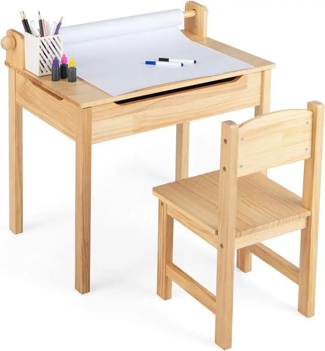 Well-Made and Kids-Friendly Details: The heights of the table and chair are scientifically designed and are suitable for kids over 3 years old. Seat height: 11". Tabletop height: 19.5". The safe rounded corners protect kids from scratching, and the cutout handles prevent kids' hands from pinching when close the tabletop.