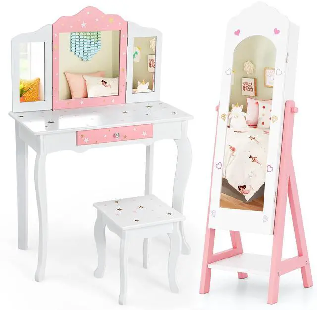 SlickBlue 2 Pieces Kids Vanity Set and Jewelry Armoire Cabinet with Full-length Mirror