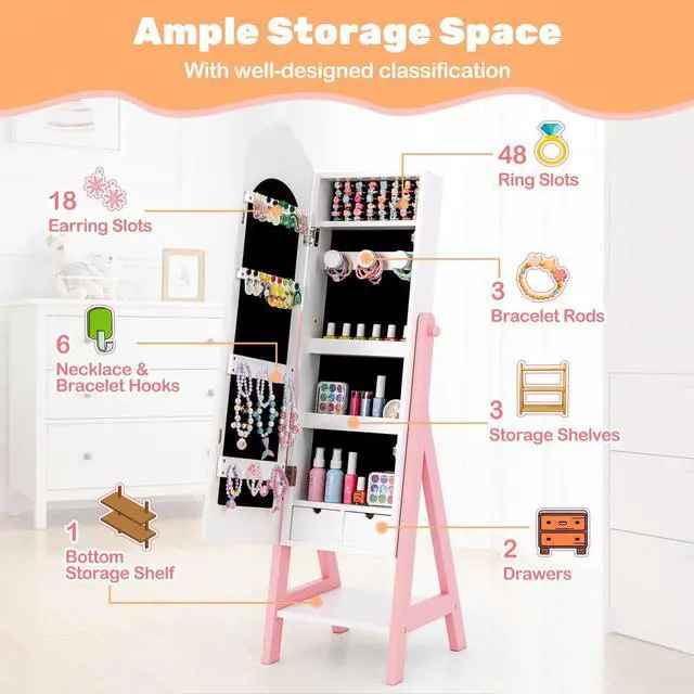 All the Jewelry, All in It: The kids jewelry organizer is built with well-designed classification to organize and protect your children's cherished jewelry, including 18 earring slots, 6 bracelets and necklaces hooks, 64 ring slots, 3 bracelet rods, 3 storage shelves, 2 drawer and 1 bottom storage shelf.