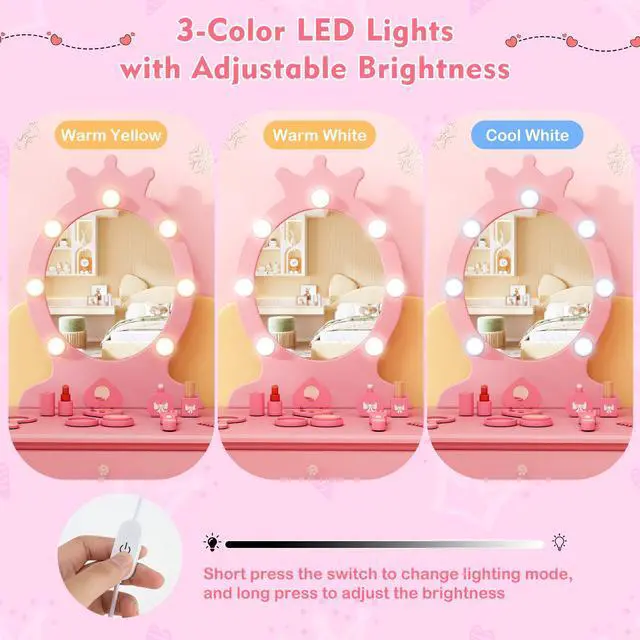 3-color Adjustable LED Lights: There are 3-color LED lights (warm yellow, warm white, cool white) decorated on the mirror to light up kids face. Kids can short press the switch to change lighting mode, and long press to adjust the brightness according to their needs.