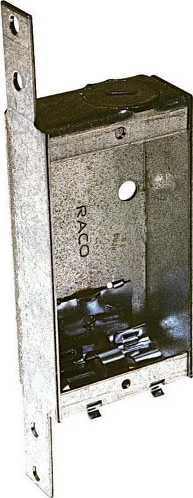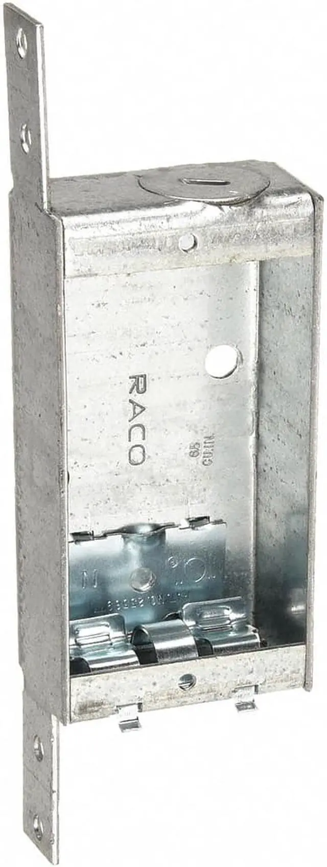 Electrical Box, Box Type Switch, Number of Gangs 1, Bracket Type Flat D, 1/4 in Setback, Capacity 6.5 cu in, Material Galvanized Zinc, Number of 1/2 In. Back Knockouts 0, Number of 1/2 In. Side Knockouts 0, Clamp Type NM-B, Nominal Depth 1 in, Nominal Length 3 3/4 in, Nominal Width 2 in, Color Silver, Standards UL File E195978. This item has been restricted from sale in the following state (s): []