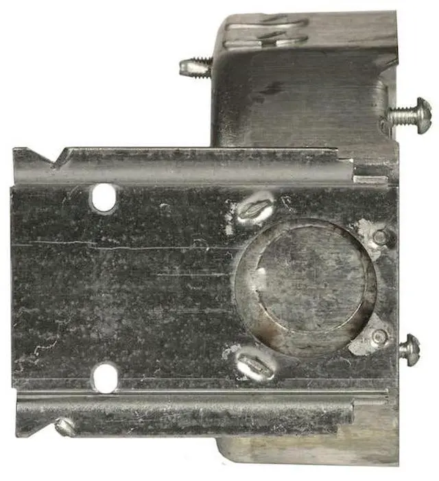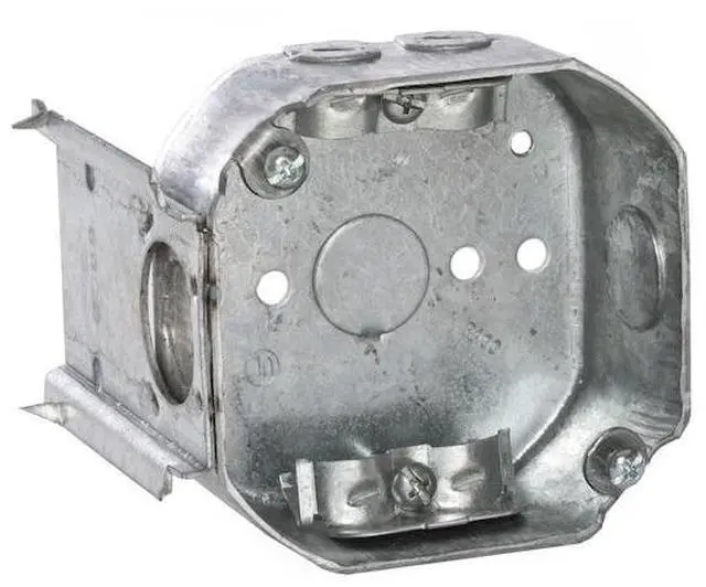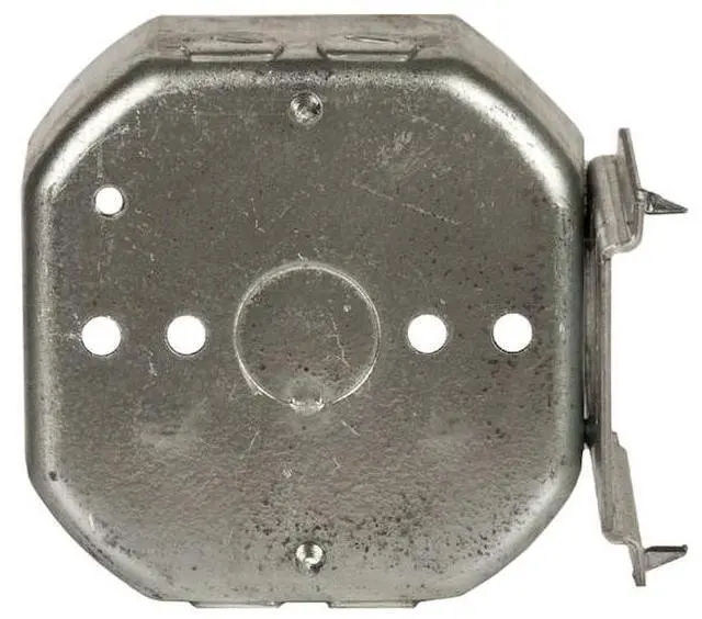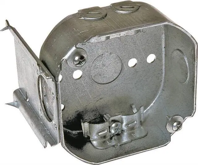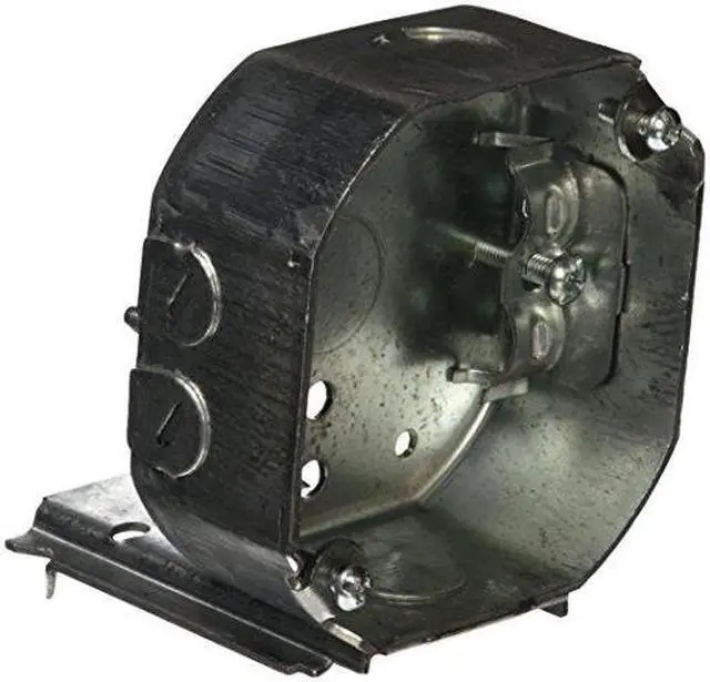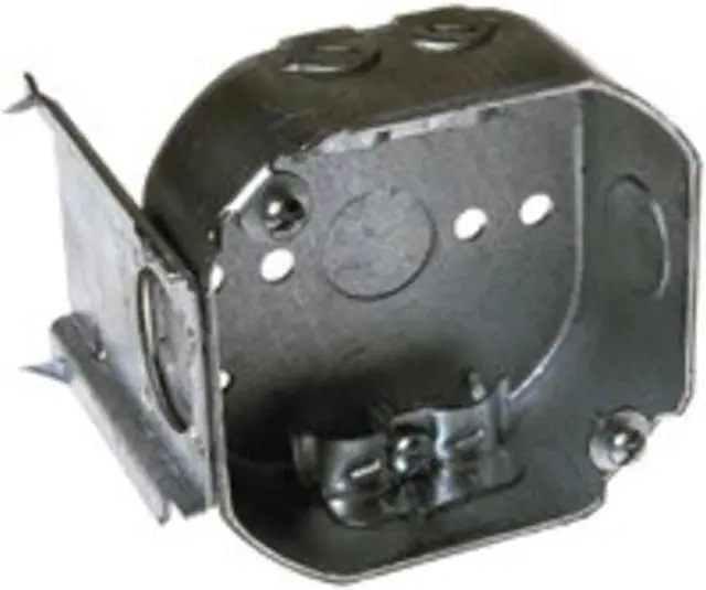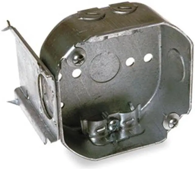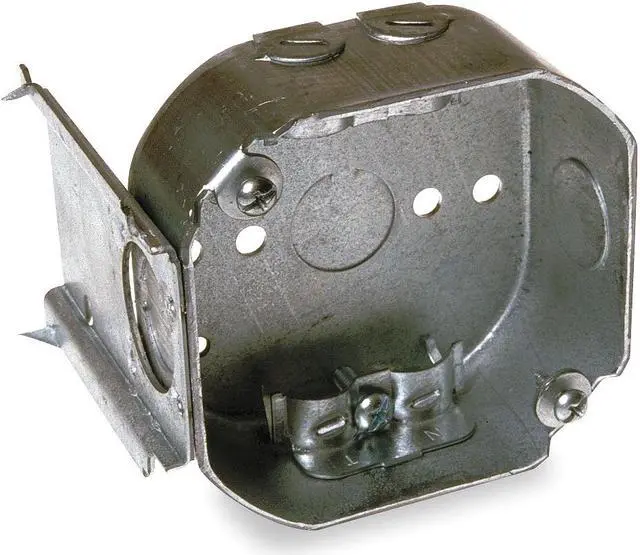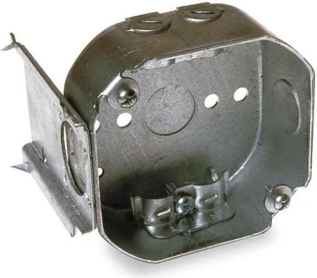 Electrical Box, Box Type Octagon with Bracket, Number of Gangs 2, Bracket Type J, Capacity 15.5 cu in, Material Steel, Number of 1/2 In. Back Knockouts 1, Number of 1/2 In. Side Knockouts 2, Clamp Type KO Clamps, NMSC Clamps, Nominal Depth 1 1/2 in, Nominal Length 4 in, Nominal Width 4 in, Color Gray, Standards UL Listed