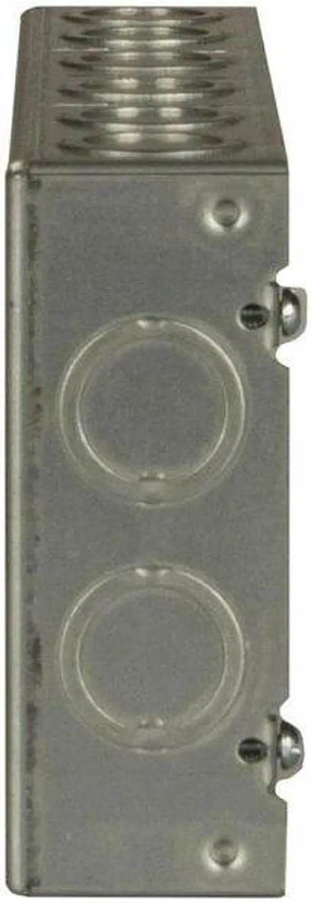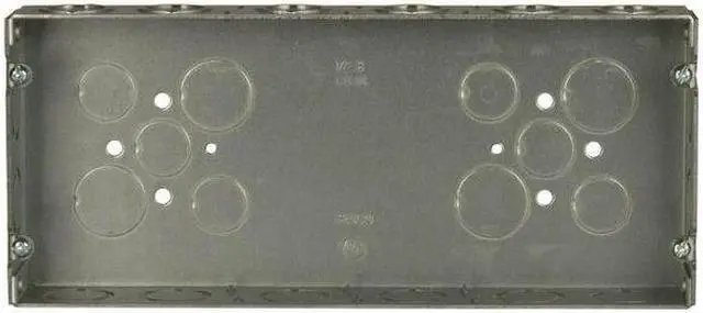 Electrical Box, Box Type Gang, Number of Gangs 4, Bracket Type Not Applicable, Capacity 72.8 cu in, Material Steel, Number of 1/2 In. Back Knockouts 6, Number of 1/2 In. Side Knockouts 16, Clamp Type -, Number of 3/4 In. Back Knockouts 4, Number of 3/4 In. Side Knockouts 16, Nominal Depth 1 5/8 in, Nominal Length 4 1/2 in, Nominal Width 10 7/16 in, Color Gray, Standards CM, RoHS, UL Listed. This item has been restricted from sale in the following state (s): []