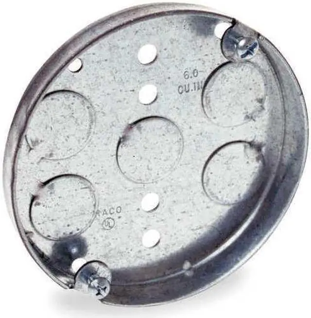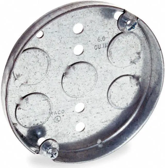 Electrical Box, Box Type Round Ceiling Pan, Number of Gangs 2, Bracket Type -, Capacity 6 cu in, Material Steel, Number of 1/2 In. Back Knockouts 0, Number of 1/2 In. Side Knockouts 0, Clamp Type -, Nominal Depth 1/2 in, Nominal Length 4 in, Nominal Width 4 in, Color Gray, Standards UL Listed. This item has been restricted from sale in the following state (s): []