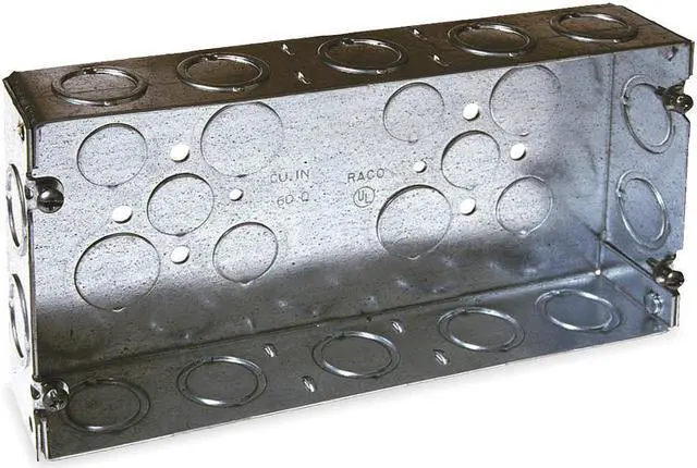 Electrical Box, Box Type Gang, Number of Gangs 3, Bracket Type -, Capacity 60 cu in, Material Galvanized Steel, Number of 1/2 In. Back Knockouts 6, Number of 1/2 In. Side Knockouts 14, Clamp Type -, Number of 3/4 In. Back Knockouts 4, Number of 3/4 In. Side Knockouts 14, Nominal Depth 1 5/8 in, Nominal Length 4 1/2 in, Nominal Width 8 5/8 in, Color Silver, Standards UL. This item has been restricted from sale in the following state (s): []