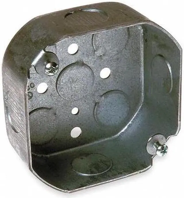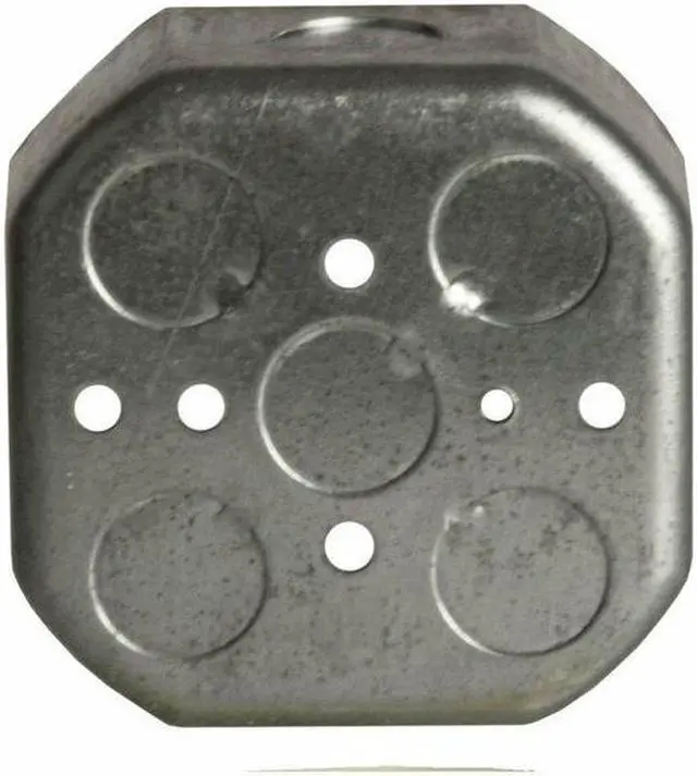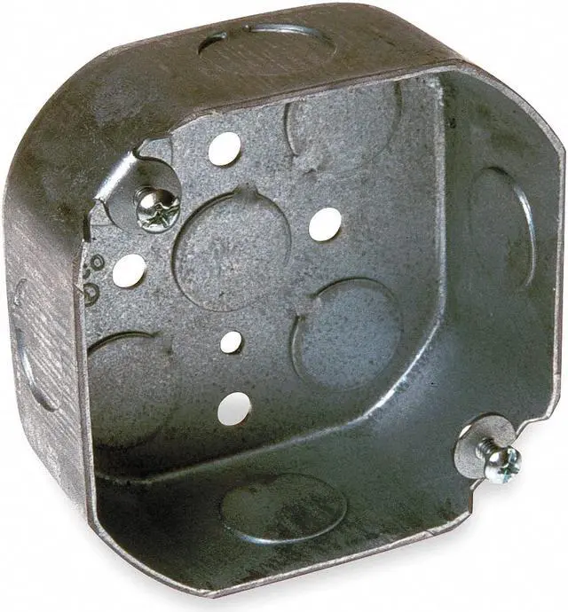 Electrical Box, Box Type Octagon, Number of Gangs 2, Bracket Type Not Applicable, Capacity 15.5 cu in, Material Steel, Number of 1/2 In. Back Knockouts 5, Number of 1/2 In. Side Knockouts 4, Clamp Type -, Nominal Depth 1 1/2 in, Nominal Length 4 in, Nominal Width 4 in, Color Gray, Standards UL Listed