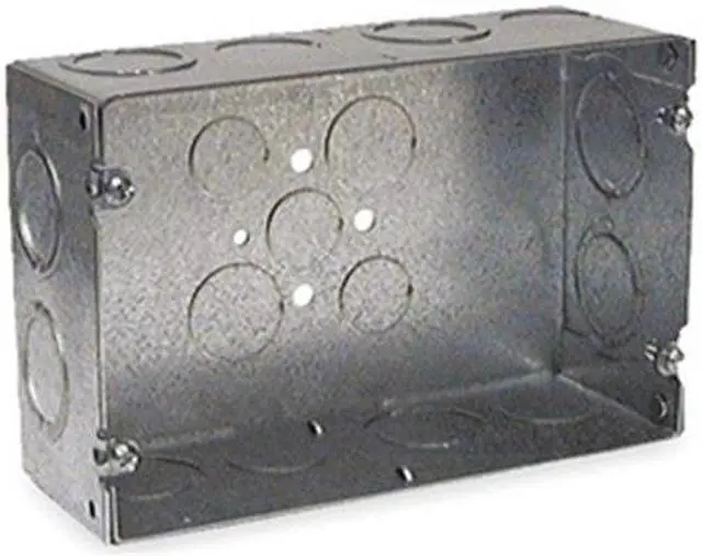 Electrical Box, Box Type Gang, Number of Gangs 2, Bracket Type Not Applicable, Capacity 47 cu in, Material Steel, Number of 1/2 In. Back Knockouts 3, Number of 1/2 In. Side Knockouts 12, Clamp Type -, Number of 3/4 In. Back Knockouts 2, Number of 3/4 In. Side Knockouts 12, Nominal Depth 1 5/8 in, Nominal Length 4 1/2 in, Nominal Width 6 13/16 in, Color Gray, Standards CM, RoHS, UL Listed. This item has been restricted from sale in the following state (s): []
