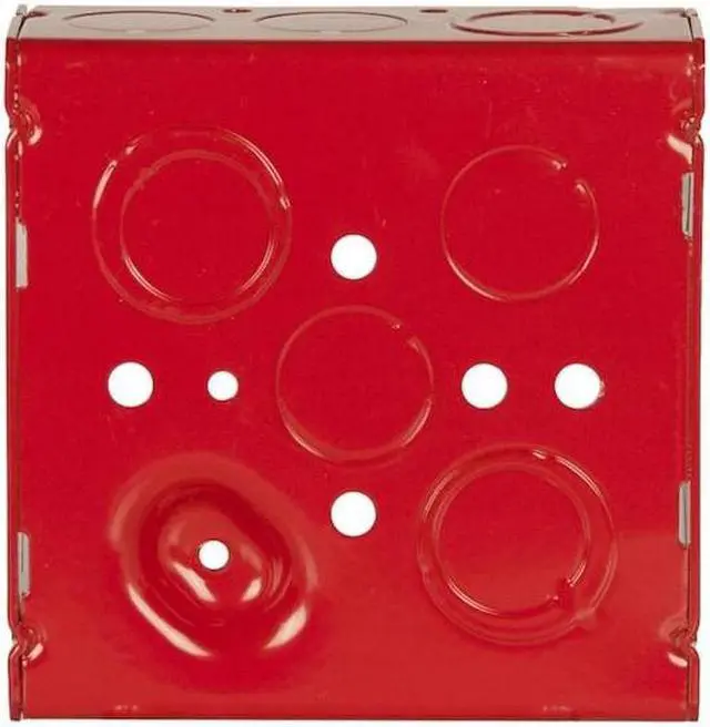 Electrical Box, Box Type Square, Number of Gangs 2, Bracket Type Not Applicable, Capacity 21 cu in, Material Steel, Number of 1/2 In. Back Knockouts 4, Number of 1/2 In. Side Knockouts 12, Clamp Type -, Number of 3/4 In. Back Knockouts 2, Number of 3/4 In. Side Knockouts 4, Nominal Depth 1 1/2 in, Nominal Length 4 in, Nominal Width 4 in, Color Red, Standards RoHS, UL Listed. This item has been restricted from sale in the following state (s): []