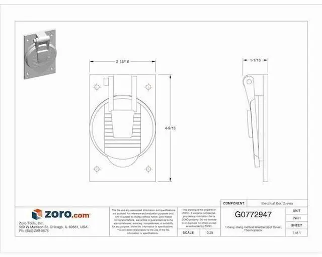 Weatherproof Cover, Mounting Box FS or FD Weatherproof Boxes, For Use With WDL In. Closed In. and WDL In. Open, In. Single Gang, Mounting Orientation Vertical, Lid Style Self Closing, Number of Gangs 1, Gasket Material Neoprene, Cover Material Aluminum, Color Gray, Height 4 9/16 in, Width 2 27/32 in, Standards CM, UL Listed, Includes Mounting Screws. This item has been restricted from sale in the following state (s): []