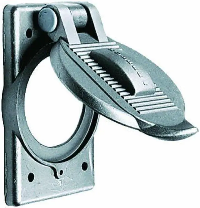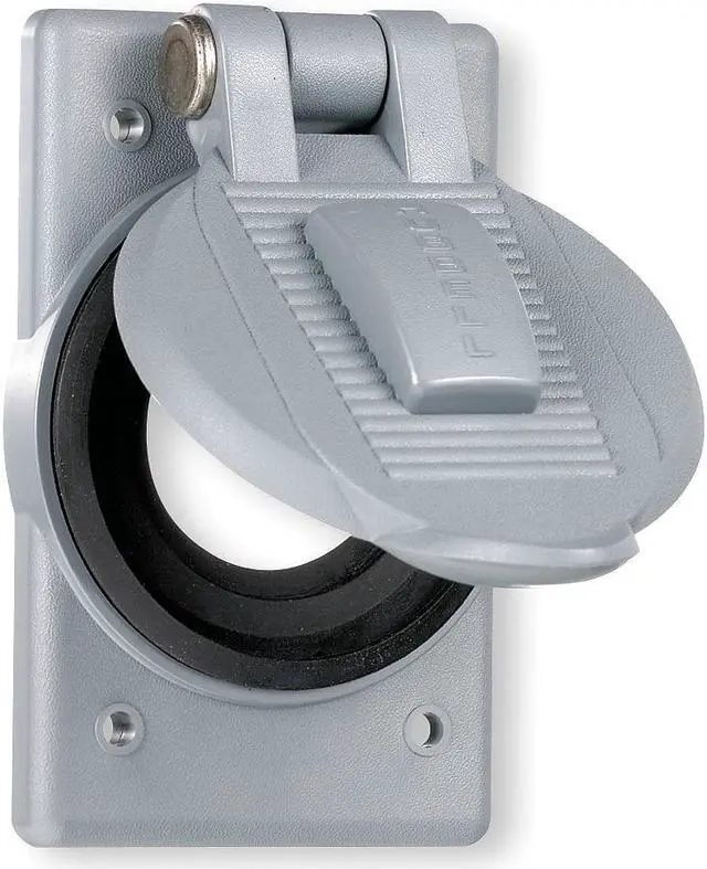 Weatherproof Cover, Mounting Box FS or FD Weatherproof Boxes, For Use With Receptacles with Face Diameter of 2.09 - 2.13 in Device Opening, Mounting Orientation Vertical, Lid Style Self Closing, Number of Gangs 1, Gasket Material Neoprene, Cover Material Cast Aluminum, Color Aluminum, Height 4 9/16 in, Width 2 27/32 in, Standards Canadian U. S, UL Listed, Includes Mounting Screws. This item has been restricted from sale in the following state (s): []