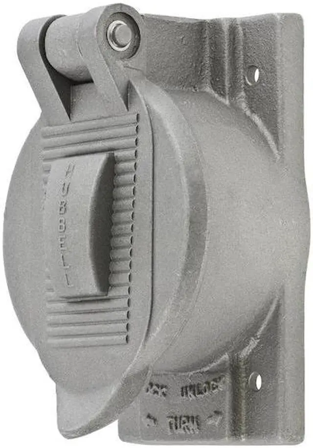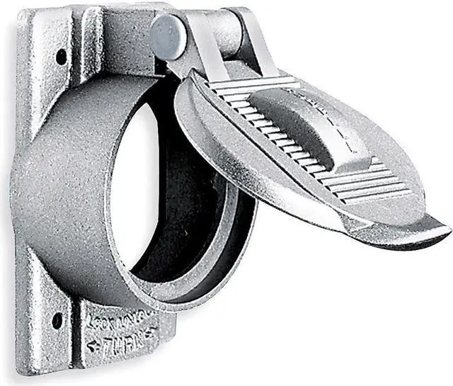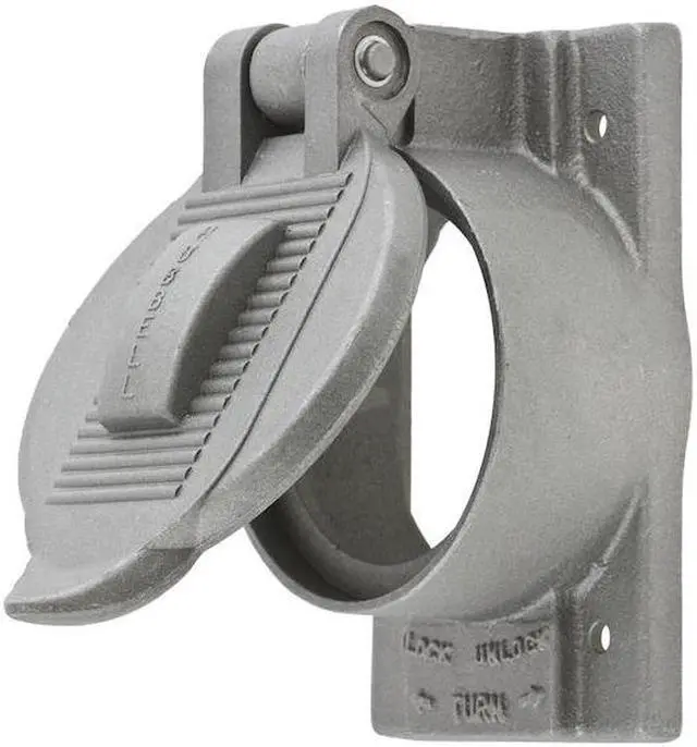 Weatherproof Cover, Mounting Box FS or FD Weatherproof Boxes, For Use With Single 50A Straight Blade Receptacles and 50A Twist-Lock (R) Receptacles, Mounting Orientation Vertical, Lid Style Self Closing, Number of Gangs 1, Gasket Material Neoprene, Cover Material Cast Aluminum, Color Aluminum, Height 4 9/16 in, Width 2 27/32 in, Standards Canadian U. S, CM, UL Listed, Includes Mounting Screws. This item has been restricted from sale in the following state (s): []