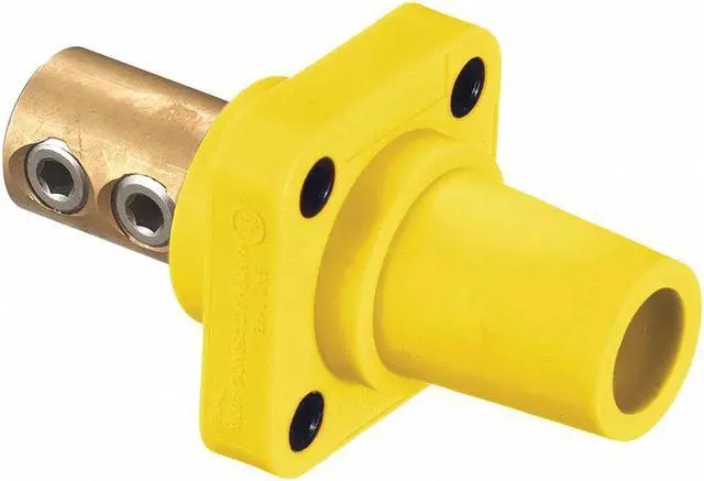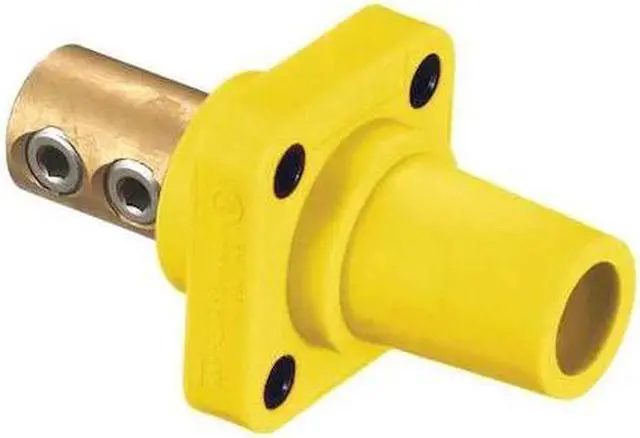 The HUBBELL Series 16 Single Pole Female Receptacle is rated for use with high ampacity electrical connections, supporting cable sizes from 4 AWG to 4/0 AWG. This panel mount receptacle features a straight connection orientation and a taper nose end type, intended for use in indoor dry locations; consult installation guidelines if additional protection is required. It utilizes a double set screw terminal connection and is constructed with a thermoplastic elastomer housing and brass contacts.