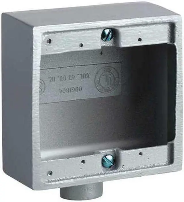 Device Box, Number of Gangs 2, Number of Inlets 1, Length 4.62 in, Width 4.62 in, Depth 2.0 in, Hub Size 3/4 in, Color Gray, Box Type FD, Capacity 47.0 cu in, Description/Special Features Internal Grounding Screw, Tapered Threads, Material Aluminum, Mounting Holes O. C. (In. ) 0.75 in