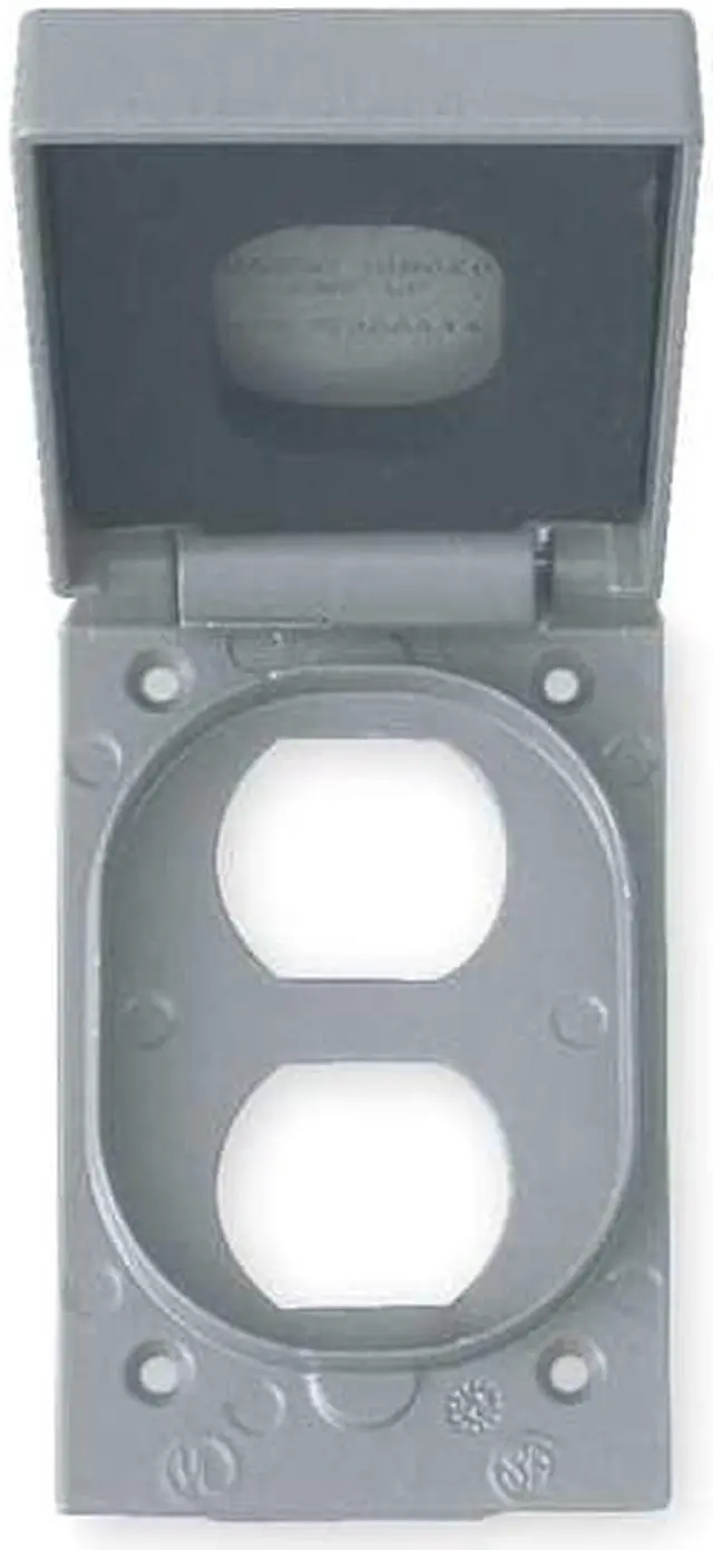Weatherproof Cover, Mounting Box FS or FD Weatherproof Boxes, For Use With Duplex Receptacles, Mounting Orientation Vertical, Lid Style Self Closing, Number of Gangs 1, Cover Material Copper-Free Aluminum, Color Gray, Height 4 41/64 in, Width 2 57/64 in, Depth 1 1/4 in, NEMA Rating 3, Standards SAC Certified File No. LR 11852, UL E 3397, Includes Gaskets. This item has been restricted from sale in the following state (s): []