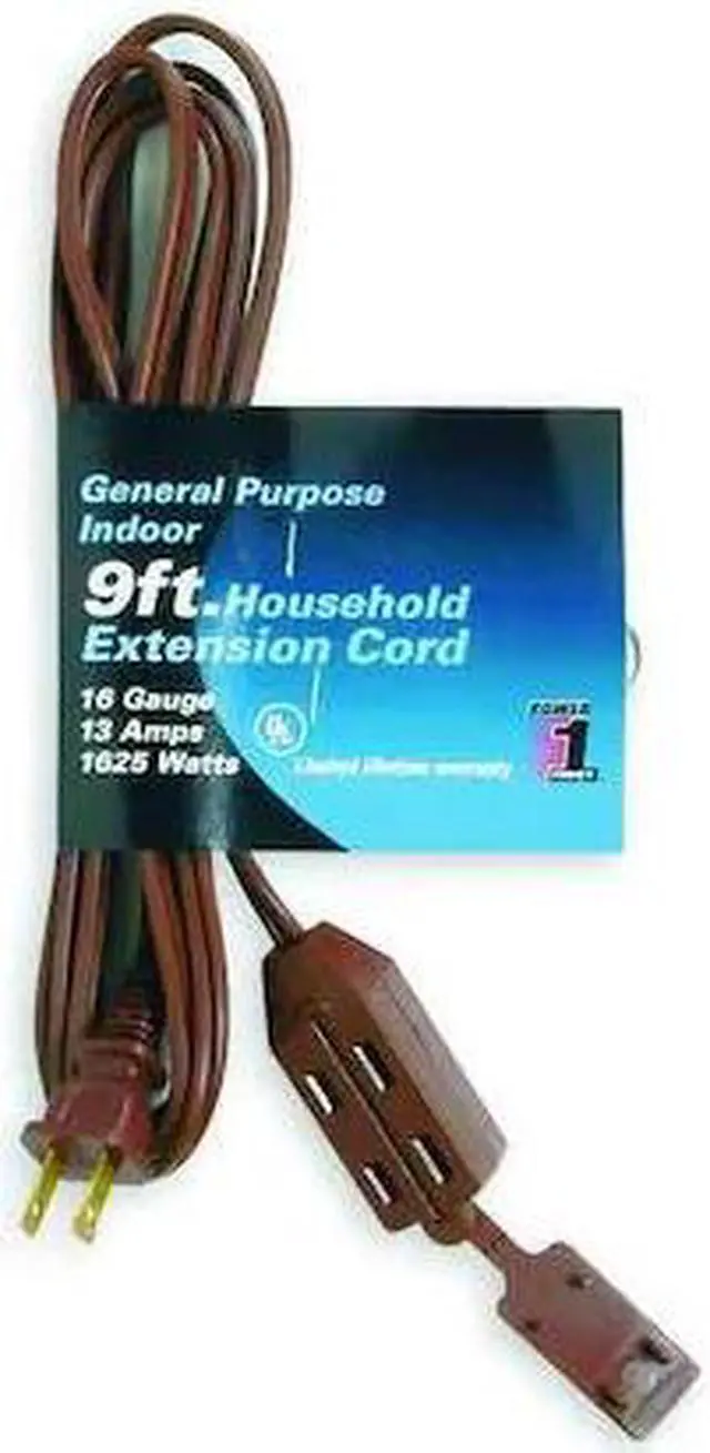 Extension Cord, Location Indoor, Cord Length 9 ft, Wire Size 16 AWG, Max. Amps 13 A, Voltage 125V AC, Plug Configuration NEMA 1-15P, Receptacle Configuration NEMA 1-15R, Cord Ending Block, Number of Outlets 3, Jacket Color Brown, Jacket Material PVC, Trade Designation SPT-2, Cord Shape Flat, Temp. Rating 32 Degrees to 140 Degrees F, Number of Conductors 2, Power Indicator No, Plug Style Straight, Max. Watts 1,625 W, Nominal Outside Dia. 0.14 in x 0.29 in