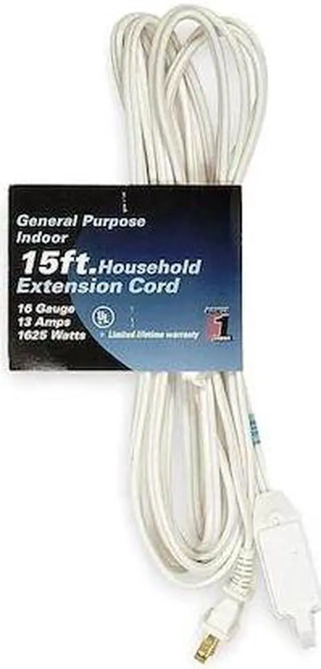 Extension Cord, Location Indoor, Cord Length 15 ft, Wire Size 16 AWG, Max. Amps 13 A, Voltage 125V AC, Plug Configuration NEMA 1-15P, Receptacle Configuration NEMA 1-15R, Cord Ending Block, Number of Outlets 3, Jacket Color White, Jacket Material PVC, Trade Designation SPT-2, Cord Shape Flat, Temp. Rating 32 Degrees to 140 Degrees F, Number of Conductors 2, Power Indicator No, Plug Style Straight, Max. Watts 1,625 W, Nominal Outside Dia. 0.14 in x 0.29 in
