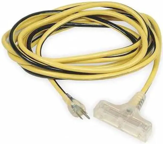 Lighted Extension Cord, Location Outdoor, Cord Length 50 ft, Wire Size 12 AWG, Max. Amps 15 A, Voltage 125V AC, Plug Configuration NEMA 5-15P, Receptacle Configuration NEMA 5-15R, Cord Ending T-Shape, Number of Outlets 3, Jacket Color Yellow with Black Stripe, Jacket Material PVC, Trade Designation SJTW, Cord Shape Round, Temp. Rating -40 Degrees to 167 Degrees F, Number of Conductors 3, Power Indicator Yes, Plug Style Straight, Max. Watts 1,875 W, Nominal Outside Dia. 0.42 in