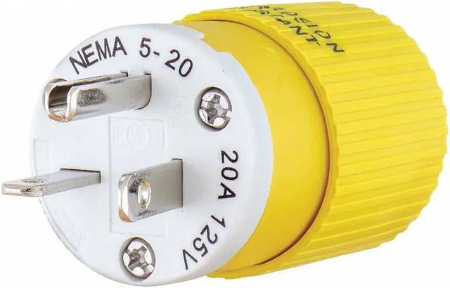 Straight Blade Plug, Connection Orientation Straight, Current Rating 20 A, Grounding Grounded, Horsepower Rating 1 hp, Housing Color Yellow, IP Rating Not Rated, NEMA Plug Configuration 5-20P, Number of Blades 3, Number of Poles 2, Phase Single, Polarized Yes, Resistance Properties Corrosion Resistant, Voltage Rating 125V AC, Wire Connection Type Screw Terminals, Wiring Style Standard, Face Diameter 1.38 in, For Maximum Cable Diameter 0.655 in, For Minimum Cable Diameter 0.245 in. This item has been restricted from sale in the following state (s): []