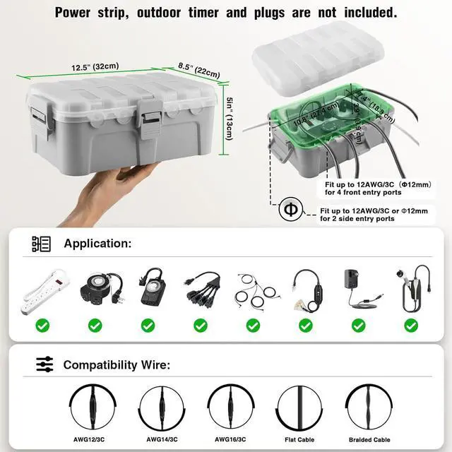 With the 4 clips, top lid, and rubber gaskets, this outdoor extension cord cover box is IP54 waterproof. Perfect to seal 12/14/16 gauge cord, braided cable and flat wire ( 6*entry ports fit up to 12AWG/3C or 12mm).