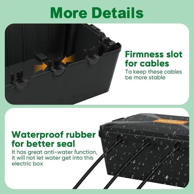 Mounting to the wall- Upgraded outdoor waterproof electrical box has two way to install. Electrical outlet box can be placed on the lawn and corner, on the wall bracket, or hung on the wall, tree and other locations need to be hung. The package includes wall-mounting screws, and our waterproof electrical boxe are easy to install and are ideal for a wide range of lawn and garden applications.