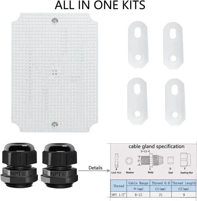 Money Saving Junction Box Sets The junction box includes a mounting plate, 4 Wall Brackets, and 2 cable glands. The ABS project boxes can be drilled and shaped easily without cracking, so its almost suitable for your all DIY projects.