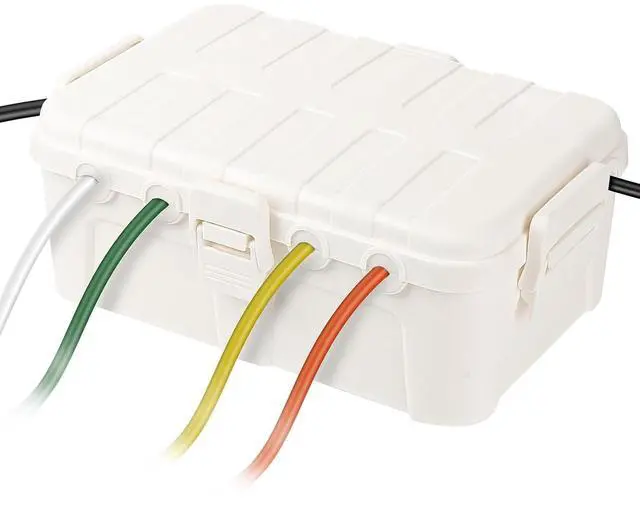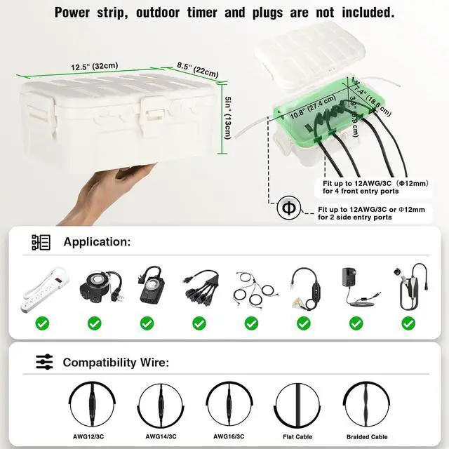 With the 4 clips, top lid, and rubber gaskets, this outdoor extension cord cover box is IP54 waterproof. Perfect to seal 12/14/16 gauge cord, braided cable and flat wire ( 6*entry ports fit up to 12AWG/3C or 12mm).