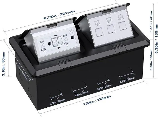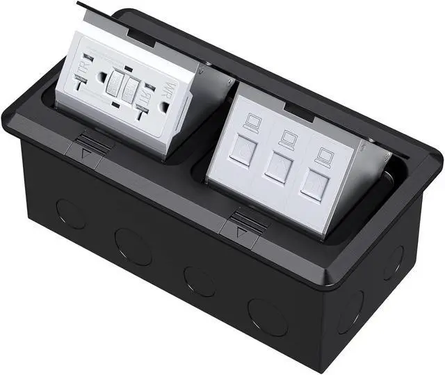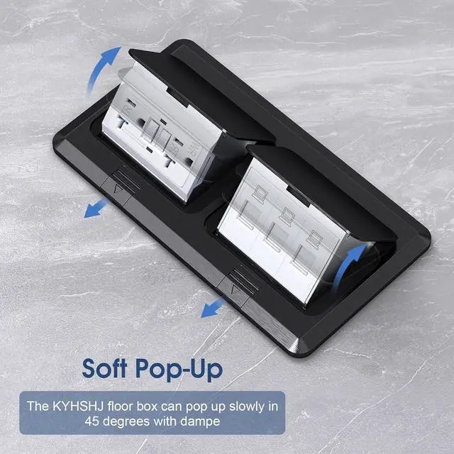 Product composition: The Dual Pop-up Floor Box Kit includes a hard material duplex pop-up floor box, 2*20A GFCI tamper resistant receptacle+3*RJ45 Adding dampers makes the product slowly open