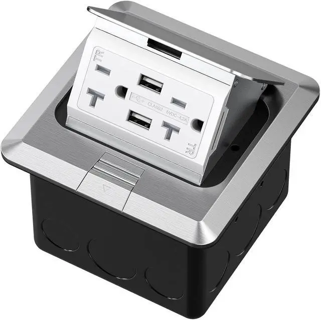 A pop up outlet box is hidden in your countertop or floor when closed, all you see is a stylish Silver top. When you push the button the top tilts open revealing the outlets.