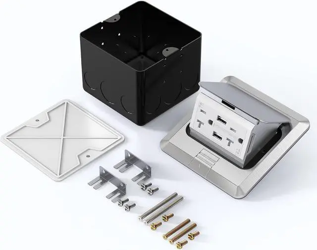 Includes: pop-up cover with receptacle outlet, weather gaskets, mounting screws, junction box, and installation instructions