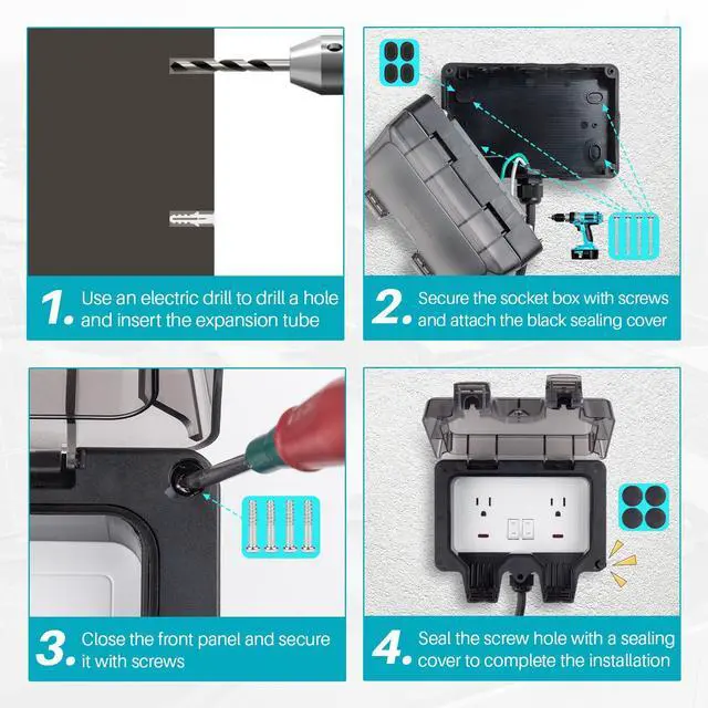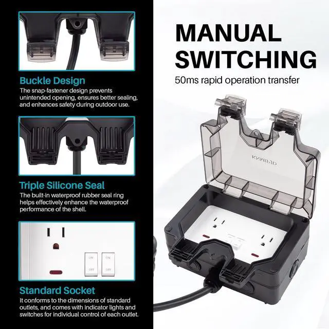 Transform your outdoor space with this versatile 15A 110V outdoor power outlet box, featuring a convenient 10-foot extension cord for flexible placement. Perfect for terraces, swimming pools, and garden areas, this outlet extender provides reliable power access where you need it most. The IP66 waterproof rating ensures protection against harsh weather conditions, making it suitable for year-round outdoor use. The outlet box is designed with safety in mind and includes essential protection features. With its durable construction and practical design, this outdoor electrical outlet solution helps you power your outdoor appliances, lighting, and tools with confidence. The 10-foot cord length offers ample reach while maintaining a secure connection to your power source. Whether you're setting up outdoor entertainment systems, landscape lighting, or power tools, this outlet box delivers the functionality you need for your outdoor electrical needs.