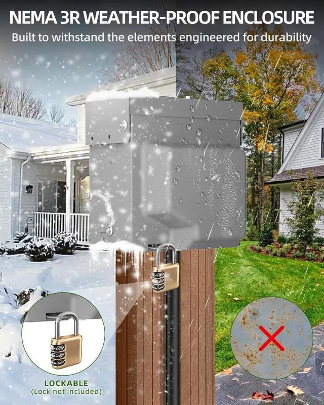ETL Certified 50 Amp RV Power Outlet Box Safe, Reliable & Ready for EV Charging This 50 amp RV outlet box is ETL certified and features a NEMA 14-50R receptacle (50 Amp / 125/250V), delivering dependable power for RVs, travel trailers, campers, and EVs. Whether used as a 14-50 EV outlet at home or as a 50 amp RV plug at a campground, it ensures secure, code-compliant power with peace of mind in both indoor and outdoor environments. Weatherproof NEMA 3R Outdoor Electrical Box Built for Harsh Environments Constructed from high-quality galvanized steel with a rust-resistant, weatherproof coating, this outdoor outlet box meets NEMA 3R standards for rain, dust, and corrosion protection. Ideal for permanent installations, it serves as a 50 amp RV receptacle, RV electrical outlet, or EV charging station that can withstand extreme conditions. Fast & Flexible Installation Pre-Punched Knockouts for Easy Wiring The 50 amp RV outlet box features pre-punched knockouts on multiple sides in various sizes, allowing for quick and convenient wiring options. Whether connecting from the side, bottom, or back, you can install this RV electrical box without the need for extra drilling. The hinged lid locks at the top, giving you full access while installing or servicing your 50 amp plug or 14-50 outlet. Built-in Power Indicator & Lockable Safety Cover A built-in LED indicator light instantly shows power status, helping you easily confirm the unit is energized. The press-to-open lid prevents accidental opening by children or pets, and the cover is also padlock-compatible for added safety. Perfect for securing your RV power outlet box in public or shared spaces. Spacious Interior Fits Large 50 Amp Plugs with Handles Designed with practicality in mind, this 50 amp receptacle box accommodates bulky 50 amp RV plugs, including those with built-in handles. The reinforced and enlarged cover plate allows for a secure closure, even when a large plug is inserted. This makes it the ideal heavy duty RV outlet for outdoor setups, whether at home, in an RV park, or on the road.