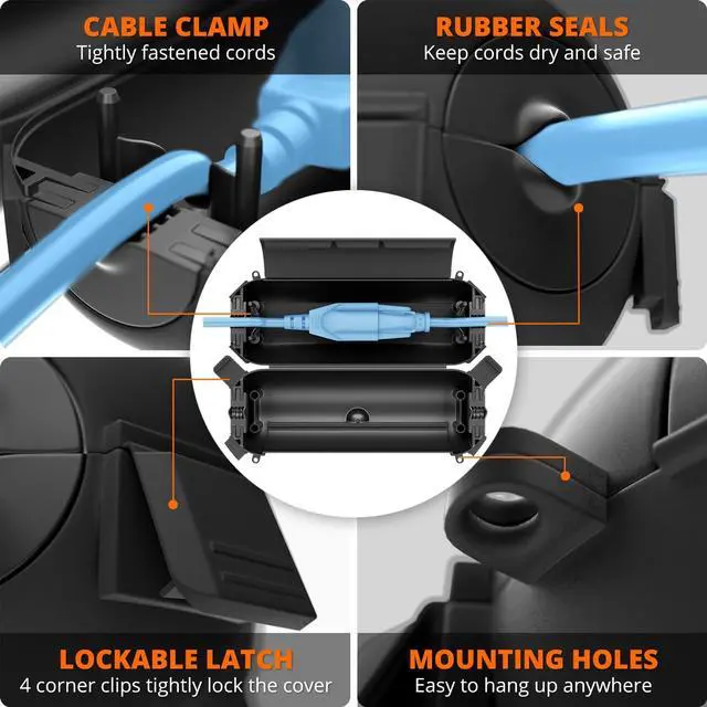 Easy to Use: This extension cord safety cover requires no installation. Simply open the top cover and four clips, insert the connecting cable into the interior, secure the cable with the cable clamp, lock it, and seal it.